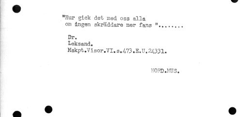 //// "Phir gick det Died oss alla //// om ingen skräddare mer fans "........ //// Dr. //// Leksand. //// Mskpt .Vi sor .VI.s.473.E.U.24331. //// * //// NOPD.MUS. ////
