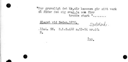 //// "Hur gruveligt det äi?,när kanonen gör sitt verk //// då föder den sig svag,ja som förr //// trodde stark "......„. //// Slaget vid Sedan.1870. //// .11;4. SN. S.I..S.422 s.53-54 nr.40. //// N. //// ÅBO. //// < ////