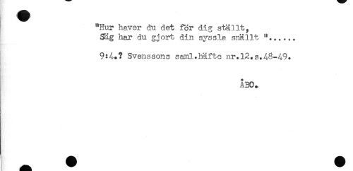 //// "Hur haver du det för dig ställt, //// Säg har du gjort din syssla snällt //// 9:4.? Svenssons saml.häfte nr.12.s.48-49. //// B ^ //// ÅBO. ////