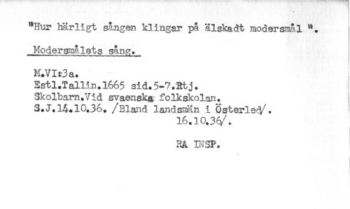 //// "Hur härligt sangen klingar på älskadt modersmål //// Modersmålets sånx. //// M.VIf3a. //// Estl.Tallin.l665 sid.5-7.Rtj. //// Skolbarn.Vid svaenskg, folkskolan. //// S.J. 14.10.36. /Bland landsnnn i Österled/. //// 16.10.36/. //// RA INSP. ////