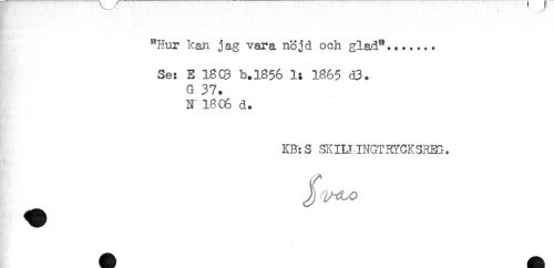 //// "Hur kan jag vara nöjd och glad"....... //// Se: E 1803 b. 1856 1: 1865 d3. //// G 37. //// N 1806 d. //// KB:S SKILTINGTRYCKSREG. ////