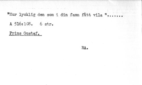 //// "Hur lycklig den som i din famn fått vila //// A 516:1C6. 6 str. //// Prins Gustaf. //// RA. ////