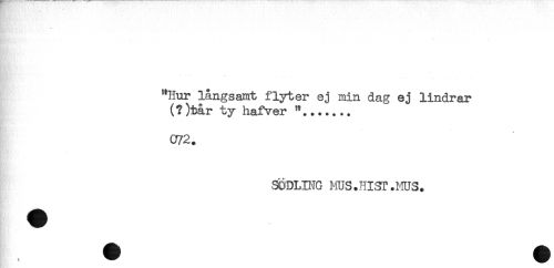 //// "Hur långsamt flyter ej min dag ej lindrar //// (?)tår ty hafver "....... //// 072. //// SCOLDm MUS.HIST.MUS. ////