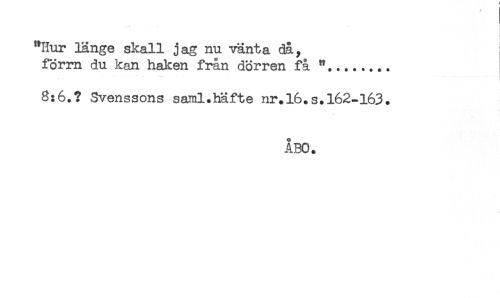 //// ... //// "Hur länge skall jag nu vänta då, //// form du kan haken från dörren få "........ //// 8:6.? Svenssons saml.häfte nr.16.s.162-163. //// ÅBO. ////