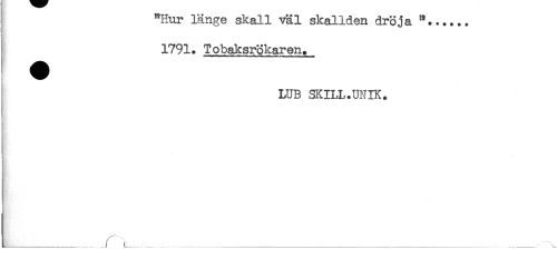 //// "Hur länge skall väl skaliden dröja "._____ //// 1791. Tobaksrökaren. //// LUB SKILL.UNIK. //// & //// t ////