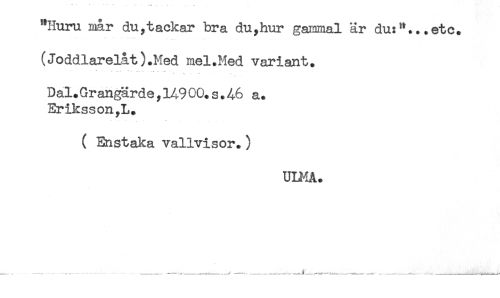 //// "Huru mar du,tackar bra du,hur gammal är du:"...etc. //// (Joddlarelåt).Med mel.Med variant. //// Dal.Grangärde,14900.s.46 a. //// Eriksson,!*. //// ( Enstaka vallvisor.) //// ULHA. ////