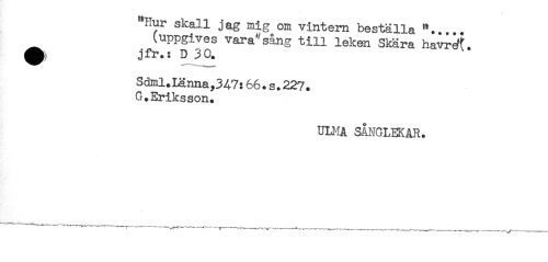 //// "Hur skall jag mig om vintern beställa //// (uppgives vara"sång till leken Skära havr^f. //// jfr.: D 30. //// Sdml.Länna,347:66.s.227. //// G.Eriksson. //// ULMA SÅNGLEKAR. //// —- r*-----—^— r———---- ////