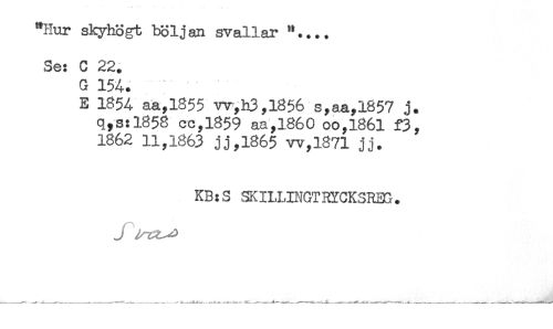 //// "Hur skyhögt böljan svallar ".... //// Se: C 22. //// G 154. //// E 1854 aa,l855 w,h3,l856 s,aa,l857 j. //// q,s:1858 CG,1859 aa,l860 oo,l86l f3, //// 1862 11,1863 jj,l865 vv,l871 jj. //// KB:S SKILLINGTRYCKSRHl. ////