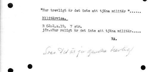 //// "Hur trevligt är det inte att tjäna militär "...... //// Militärvisa. //// B 62:2.s. 19. 7 str. //// jfr.:Hur roligt är det inte att tjäna militär..... //// RA. ////