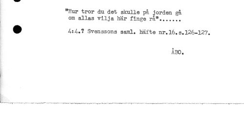 //// "Hur tror du det skulle på jorden gå //// om allas vilja här finge rå"....... //// ^ 4:4.? Svenssons sajnl. häfte nr.l6.s.126-127. //// ÅBO. ////