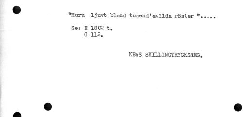 //// "Huru ljuvt bland tusend'skilda röster //// Se: E 18C2 t. //// G 112. //// KB:S SKILLINGTRYCKSREG. //// . ////