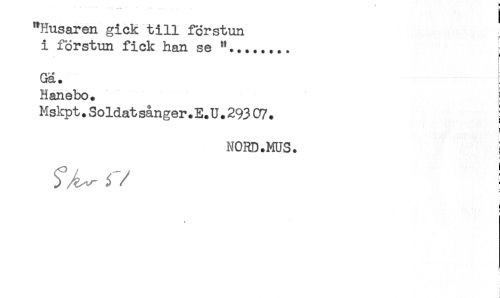 //// "Husaren gick till förstun //// i förstun fick han se "........ ! //// i //// < //// Ga. //// Hanebo. //// Mskpt.Soldatsånger.E.U.293 07. ; //// ! //// NORD.MUS. //// fÄ- 3/ ' //// i ////