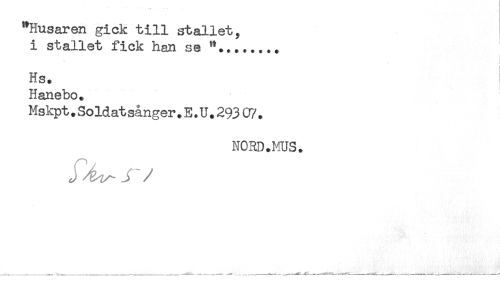 //// "Husaren gick till stallet, //// i stallet fick han se "........ //// Hs. //// Hanebo. //// Mskpt.Soldatsånger.E.U.293 07. //// NORD.MS. //// / ////