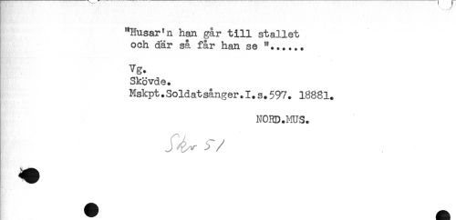 //// "Husar'n han går till stallet //// och där så får han se "...... //// Vg- //// Skövde. //// Mskpt.Soldatsånger.I.s.597. 18881. //// NORD.MUS. //// ! * ////