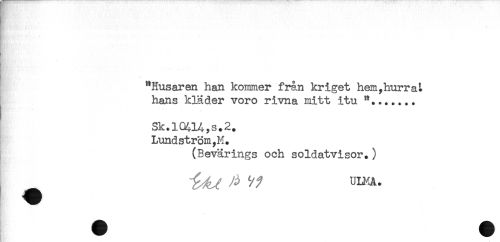 //// HBf'' < //// K''' //// "Husaren han kommer från kriget hem,hmT^ //// hans kläder voro rivna mitt itu //// Sk.lQ414,s.2. //// Lund str öm, M. //// A //// (Bevärings och soldatvisor.) ////