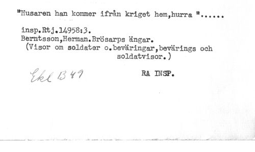 //// "Husaren han kommer ifrån kriget hem,hurra //// insp.Rtj.%958:3. //// Bérntsson,Herman.Brosarps ängar. //// (Visor om soldater o.beväringar,bevärings och //// soldatvisor.) //// ^ V/ RA INSP. //// / ////