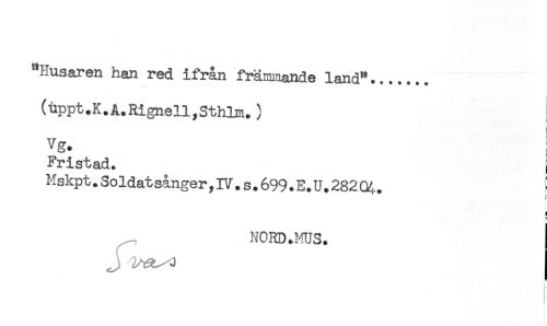 //// "Husaren han red ifrån främmande land"....... //// (uppt.K.A.Rignell,Sthlm.) //// Vg. //// Fristad. i //// Mskpt.Soldatsånger,IV.s.699.E.U.282 %. ! //// f //// i //// r //// NORD.MUS. ////