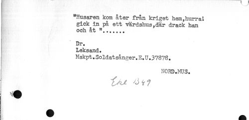 //// j "Husaren kom åter från kriget hem,hurraL //// gick^in på ett värdshus,där drack han //// [ och åt //// Dr. //// Leksand. //// Mskpt.SoIdat sånger.E.U.37878. //// NORD.MS. ////