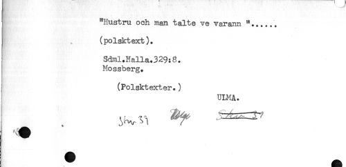 //// "Hustru och man talte ve varann //// (polsktext). //// S Sdml.Halla.329:8. //// ' Mossberg. //// I (Polsktexter.) //// ' ULMA. //// j + ////