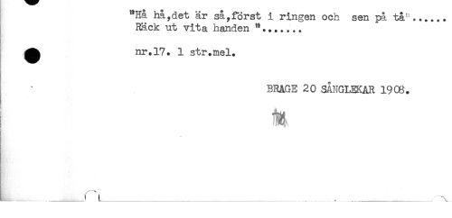 //// "Ha ha,det är sa^först i ringen och sen på tå"..... //// Räck ut vita handen "....... //// nr. 17. 1 str.mel. //// BRåGE 20 SÅNGLEKAR 19 (R. //// j M //// i ////