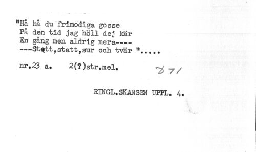 //// "Hå hå du frimodiga gosse //// På den tid jag höll dej kär //// En gång men aldrig mera---- //// ---Stqttystattysur och tvär '*.. + .. //// nr.23 a. 2(?)str.mel. ^ y/ //// RINGL.SKMSEH UPPL. ////