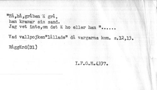 //// "Hå, ha, grå ben ä grå, //// han kramar sin sand. //// Jag vet inte,om det ä ho eller han ..... //// Vad vallpojken*lållade" då vargarna kom. s.12,13. //// " ------- - - * //// Råggärd(Dl) ^ //// I.F.G.H.4337. ////