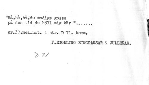 //// ....... ^ //// **Håyhåyhåydu modige gosse //// på den tid du höll mig kär *..............! //// nr.37.mel.not. 1 str. D 71. komm. ^ //// F.BGGELING RINGDANSAR & JULLEKAR. //// < //// t ////