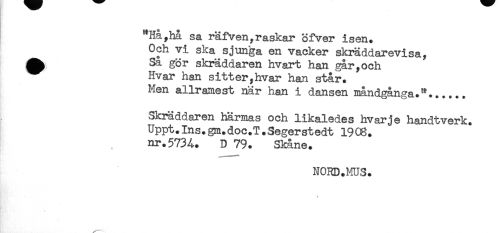 //// "Håyhå sa räfven,raskar öfver isen. //// Och vi ska sjunga en vacker skräddarevisa, //// Éh S^ gör skräddaren hvart han går,och //// Hvar han sitter,hvar han står. //// Men allramest när han i dansen måndgånga. //// Skräddaren härmas och likaledes hvarje handtverk. //// Uppt.Ins.gm.doc.T.Segerstedt 1908. //// nr.5734^ D 79. Skåne. //// NORD.MUS. //// t. ////