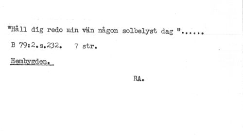 //// / //// "Hall dig redo min vän någon solbelyst dag ^ //// B 79:2.s.232. 7 str. //// * ! //// ) //// Hembygden. //// RÄ. ////
