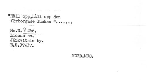 //// *M * -* ............ //// "Håll oppyhåll opp den //// förborgade luckan //// Me.D.? 266. //// Lidens sn. //// Jarkvitsle by. //// E.U.37A37. //// NORD.MUS. ////