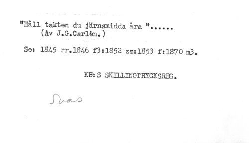 //// "Håll takten du järnsmidda åra "..,... //// (Av J.G.Carl&n.) //// Se: 1845 rr.1846 f3:i852 zz:l853 f:l870 m3. //// KB:S SKILLINGTHYCKSRBK. ////