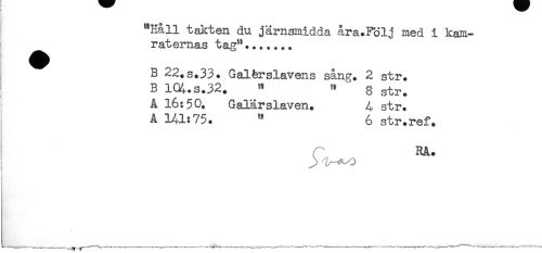 //// "Håll takten du järnsmidda åra.FSlj med i kam- //// ^ ratemas tag"....... //// B 22.S.33. Gal&rslavens sång. 2 str. //// B lC^.s.32. " g str. //// A 16:50. Galärslaven. 4 str. //// A 141:75. " 6 str.ref. //// r RA. //// I ////