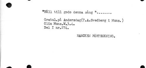 //// "Håll till godo denna sång "........ //// Gratul.på Andersdag(T.A.Svedberg i Muns.) //// Olin Muns.W.3.4. //// Del I nr.274. //// RANCKEtJ FCRTBGKNING. ////