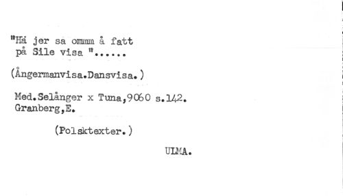//// "Ha jer sa oimam å fatt //// på Sile visa "...... //// * //// (Angermanvisa.Dansvisa.) ! //// Med.Selånger x Tuna,9060 S.1A2. } //// Granberg,E. //// (Polsktexter.) //// ULMA. //// < ////