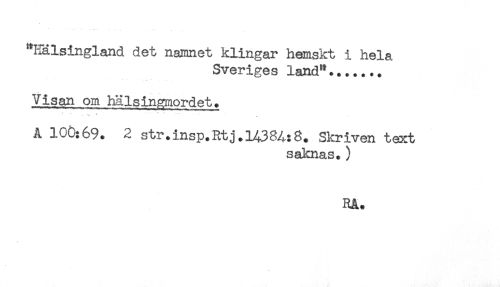 //// "Hälsingland det namnet klingar hemskt i hela //// Sveriges land"....... //// Visan om hälsingmordet. //// ...... * //// A 100:69. 2 str.insp.Rtj.14384:8. Skriven text //// saknas.) //// RA. ////