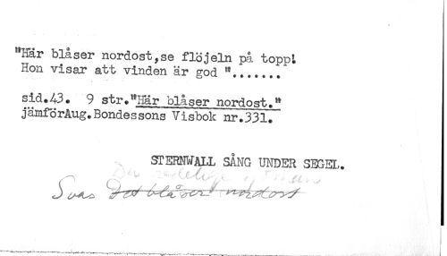 //// "Här blåser nordost,se flöjeln på toppt //// Hon visar att vinden är god ".......* //// sid.A3. 9 str.*Här blåser nordost." //// jämför Ang. Bondessons Visbok nr. 331."' //// STEHNWALL SÅNG UNDER SEGEL. ////