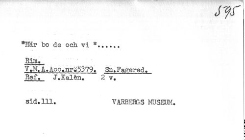 //// "Här bo de och vi "...... //// Rim. //// V.M.A.Acc.nr^5379. Sn.Fasered. //// Ref. J.Kal&n. 2 v. //// sid. 111. VARBEBGS HUSEUI-I. //// i //// g //// } //// L //// H //// B ////