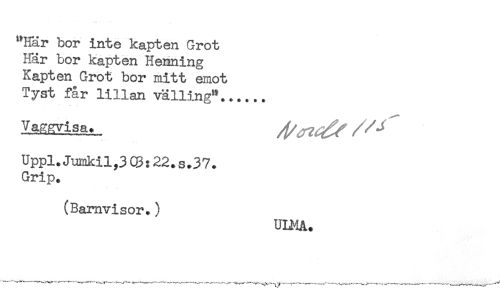 //// "Här bor inte kapten Grot //// Har bor kapten Henning //// Kapten Grot bor mitt emot //// Tyst får lillan välling*...... //// Uppl. Juiakil,3 03:22. s.37. //// Grip. //// (Barnvisor.) ////