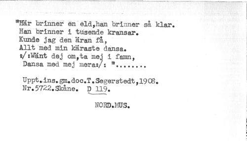//// -T- - - .-........... . . . ___ //// "Här brinner en eld,han brinner så klar. //// Han brinner i tusende kransar. //// Kunde jag den äran få. //// Allt med min käraste dansa. //// :/ :Wänt dej om, t a mej i famn, //// Dansa med mej mera:/: **....*... //// Uppt.ins.gm.doc.T.Segerstedt,1906. //// Nr.5722.Skåne. D 119. //// NORD.MUS. //// i //// h //// < //// a ////