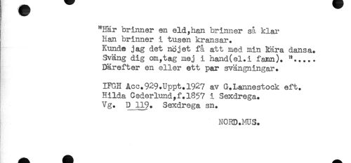 //// "Har brinner en eld,han brinner så klar //// Han brinner i tusen kransar. //// Kunde jag det nöjet få att med min kära dansa. //// Sväng dig om,tag mej i hand(el.i famn). //// Därefter en eller ett par svängningar. //// IFGH Acc.929.Uppt.1927 av G.Lannestock eft. //// Hilda Cederlundyf.1857 i Sexdrega. //// Vg. D 119. Sexdrega sn. //// NORD.MUS. //// R; ////