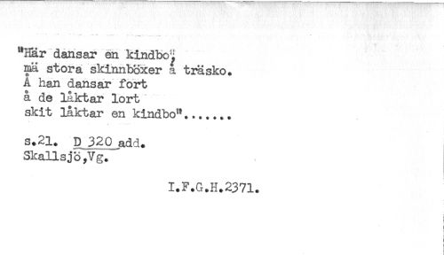 //// * ' " "" - .......T -- ... - --- //// "Har dansar en kindbci //// mä stora skinnböxer a ti^sko. //// A han dansar fort //// å de Liktar lort //// skit låktar en kindbo"....... //// s+21. D 320 add. //// Skallsjö Jg. //// I.F.G.H.2371. //// i //// ! //// ! //// ! ////