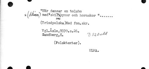 //// / ^, "Har dansar en tolsbo //// ^(p^^)med^skil^byxor och hornskor "....... //// (Trindpolska)Med fon.skr. //// Vgl.Åsle,9339.s.26. //// Sandberg,5. //// (Polsktexter). //// ULMA. //// * ////