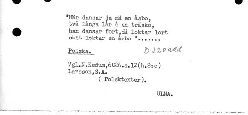 //// "Här dansar ja xaä en åsbo, //// två långa lår å en träsko, //// ^ han dansar fort,dä loktar lort //// skit loktar en åsbo //// Polska. //// Vgl.N.Kedmn,6026.s.l2(h.8:o) //// Larsson,3.Å. //// ( Polsktexter). //// * ////