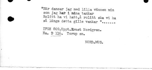 //// "Här dansar jag med lilla vännen min //// som jag har i måna tankar //// ^ Rolitt ha vi hatt,å rolitt ska vi ha //// ^ så länge detta gille vankar "....... //// IFGH 869.Uppt.Emst Nordgren. //// Ha. D 116. Torup sn. //// NORD.ms. ////
