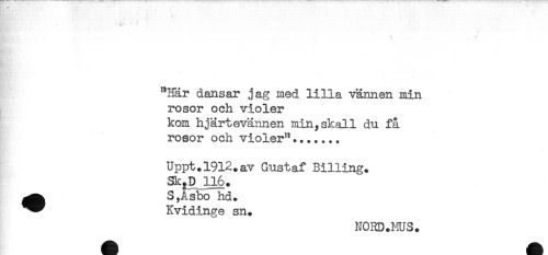 //// t* * * //// "Här dansar jag med lilla vännen min //// rosor och violer //// kom hjärtevännen min,skall du få //// rosor och violer"....... //// Uppt.1912.av Gustaf Billing. //// SksD 116. //// ^^ S,Asbo hd. //// ^^ Kvidinge sn. ////