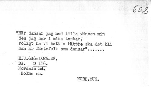 //// "Här dansar jag med lilla vännen min //// den jag Rar i mina tankar, //// roligt ha vi hatt o bättre ska det bli //// han är fästefolk som dansar"....... //// " * - .... , * //// E.U.6-16-1086-28. //// Ds. D 116. //// Nordals MT //// Holms sn. ////