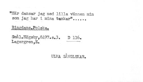 //// "Har dansar jag med lilla vännen min //// som j ag har i mina tankar"...... //// Ringdans. Polska^ //// Smal.HSgsby,8497.s.3. D 116. //// Lagergren,E. - //// ULMA SANGLEKAR. ////