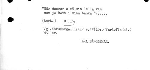 //// r //// F. //// - //// "Här dansar a mä min iella vän //// sum ja hatt i mina tanka //// ^ (text.) D 116. //// Vgl.Korsberga,11:412 s.40(l6:o Vartofta hd.) //// Möller. //// ULMA SANGLEKAR. ////