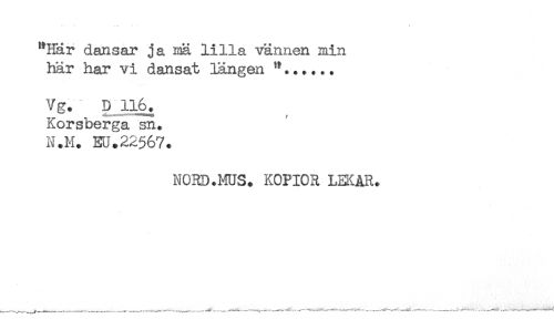 //// "Här dansar ja mä lilla vännen min //// här har vi dansat längen //// Vg. D 116. //// Korsberga sn. //// N.M. EU.22567. //// NORD.HUS. KOPIOR LEKAR. ////