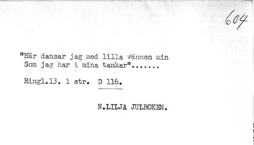 //// < //// } //// "Här dansar jag med lilla vännen min //// Som jag har i mina tankar"....... //// Ringl.13. 1 str. D 116. //// i //// i //// N.LILJA JULBOKEN. //// ) //// K ////